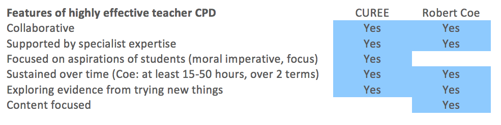 This is interesting, but does it explain what kind of professional development is most effective? Professor Robert Coe: “We do not know a lot about the impact of teachers’ CPD on students’ learning outcomes, but what we do know suggests two things: that the right kind of CPD can produce big benefits for learners, and that most of the CPD undertaken by teachers is not this kind.” The table below summarises research on the criteria of highly effective CPD, as described in two recent reports (by CUREE and by Rob Coe).